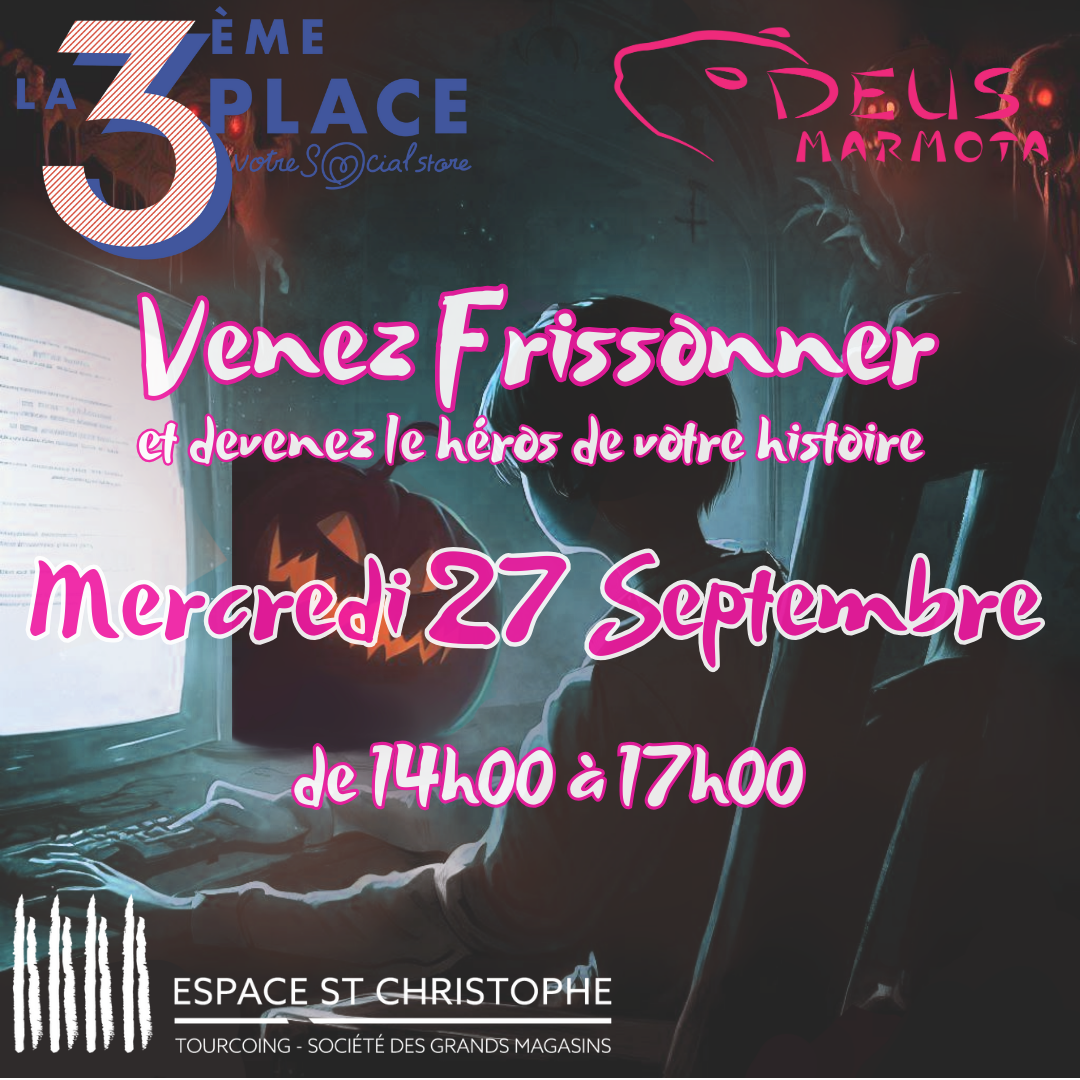 Date 27 Sep 2023 Heure 2:00 pm - 5:00 pm Venez frissoner et devenez le héros de votre histoire Venez frissonner et devenez le héros de votre histoire avec le studio DEUS MARMOTA Partagez cet événement + Ajouter à mon Agenda Google + iCal / Outlook export 00 jours 00 heures 00 minutes 00 secondes